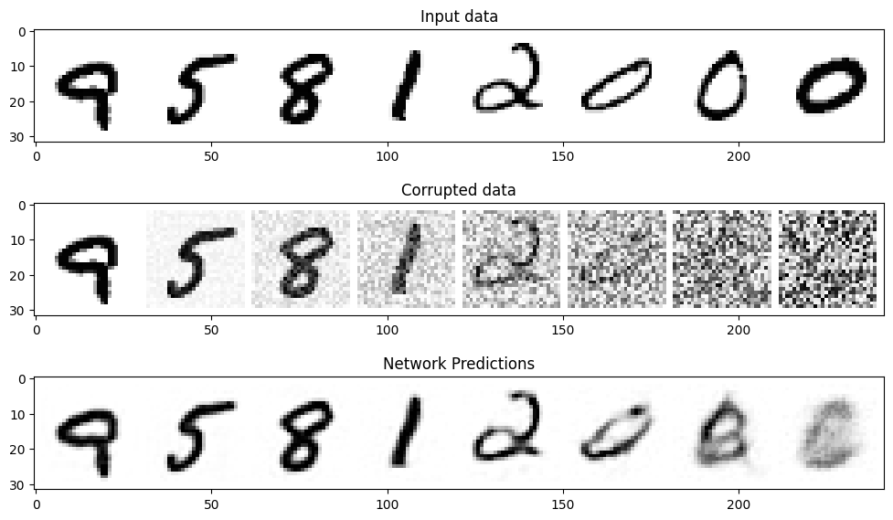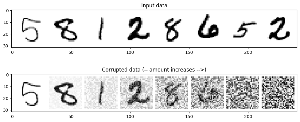 axs[1].set_title('Corrupted data (-- amount increases -->)')