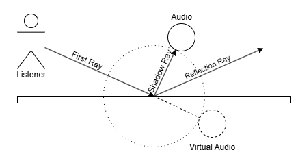 이를 Backward로 역추척하기 위해 Shadow Ray의 길이를 누적하며 (Backward 기준) 처음 충돌한 지점을 저장해둔다. 아래 사진에서 Virtual Audio까지의 거리는 |First Ray| + |Shadow Ray| 만큼이며 각도는 (FirstHitPosition - Listener) 와 같을 것이다.