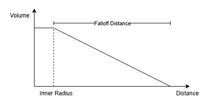 이 모델은 일정 거리(Inner Radius)까지는 볼륨이 100%였다가, 일정 거리 이후로는 Attenuation Function에 따라 소리가 Falloff Distance에 걸쳐 점차 줄어들고 그 끝에는 0%가 된다. 아래는 Attenuation Function이 Linear일 때 거리와 소리 크기의 관계를 그린 것이다.