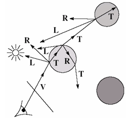 이때 과 는 Hit point에서 다시 Ray를 재생성하게 된다. 따라서 Ray의 수는 Hit될 때마다 2배수로 늘어나게 된다.
