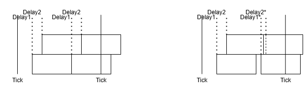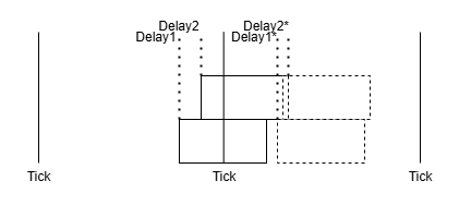 아래 왼쪽은 움직이지 않아 Delay1, Delay2가 일정한 상황을 보여주며, 오른쪽은 움직이면서 Ray 길이가 달라져 Delay1, Delay2가 변화하는 상황을 보여준다. 오른쪽의 경우 각 블럭이 겹치거나 떨어지는 현상이 나타난다.
