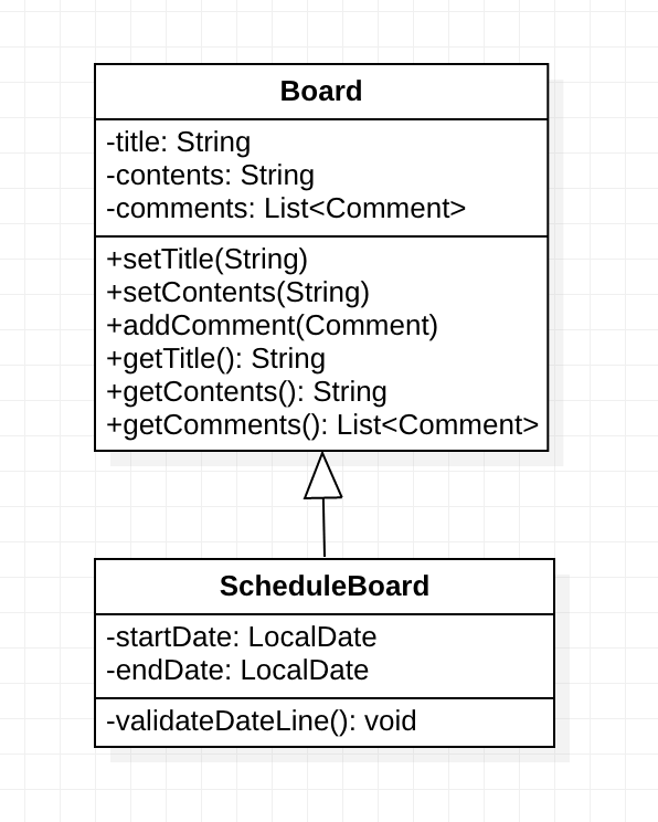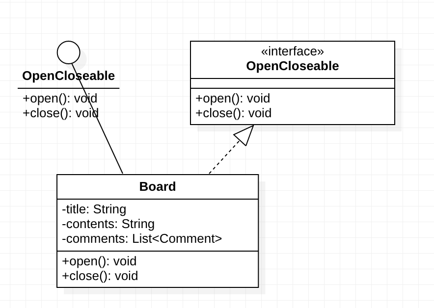 pec을 오버라이딩하여 실제로 구현하는 것 : 점선과 비어있는 화살표로 표현