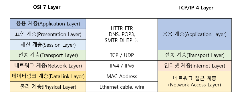 | 5 | 세션계층 Session | Data | - | NetBIOS, SSH, SSL, TLS, PIPO, AppleTalk |
