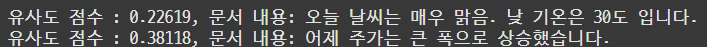 print(f'유사도 점수 : {round(doc[1], 5)}, 문서 내용 : {doc[0].page_content}')