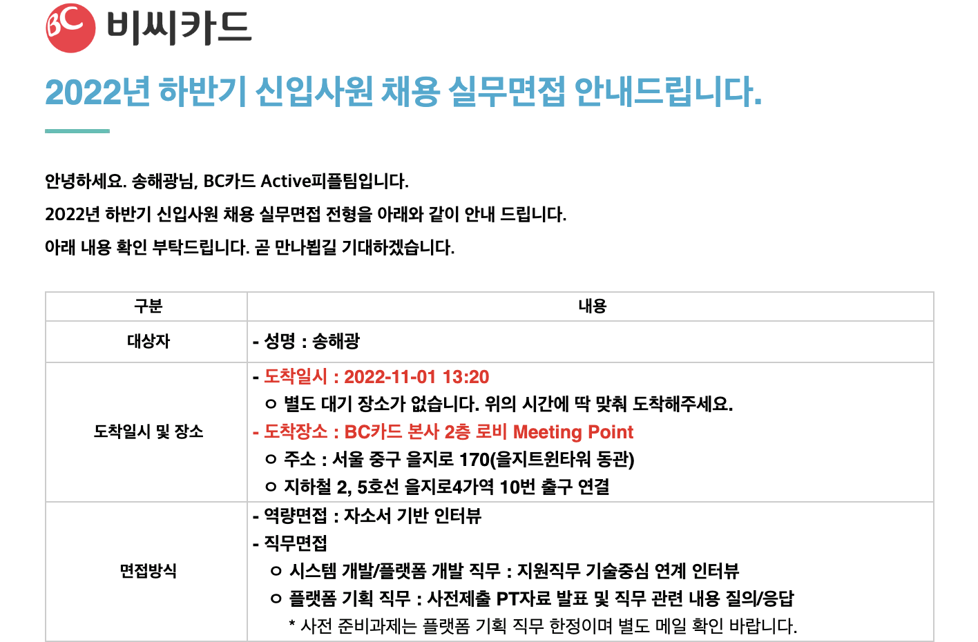 비씨카드는 하루에 직무면접과 역량면접을 한 번에 실시한다.