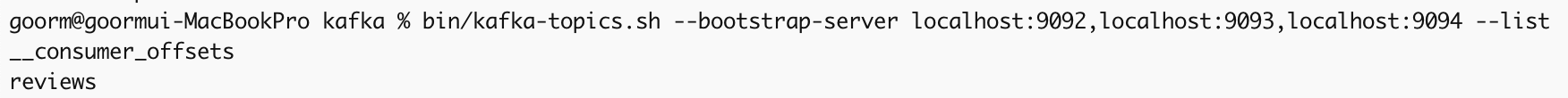 bin/kafka-topics.sh \ --bootstrap-server localhost:9092,localhost:9093,localhost:9094 \ --list