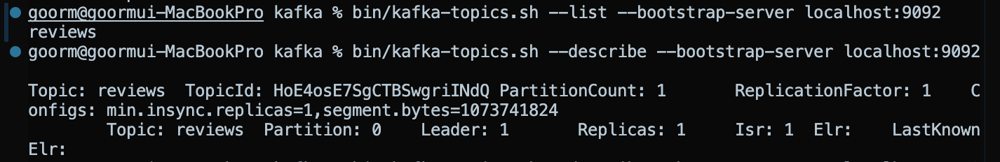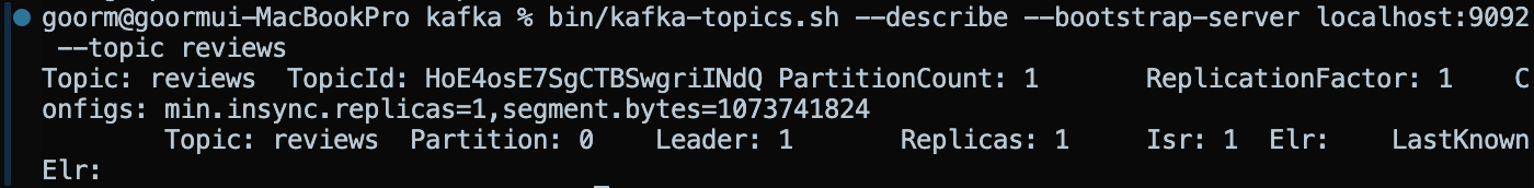 bin/kafka-topics.sh --describe --bootstrap-server localhost:9092 --topic reviews