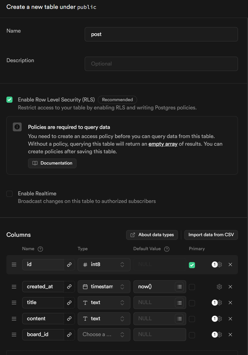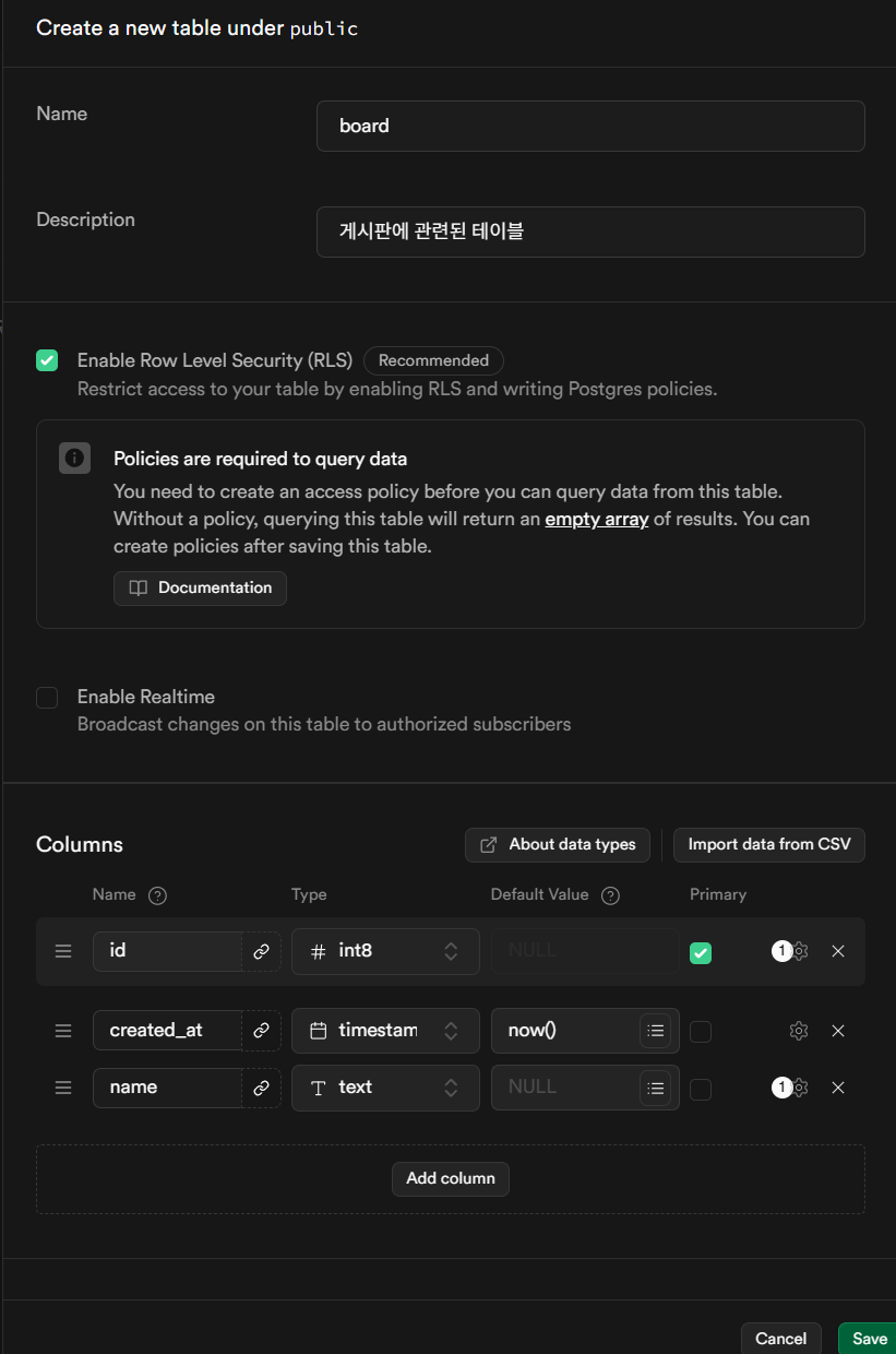 Save 버튼을 눌러 테이블을 생성해준다. 필자는 게시판에 대한 스키마로 구성하였다.