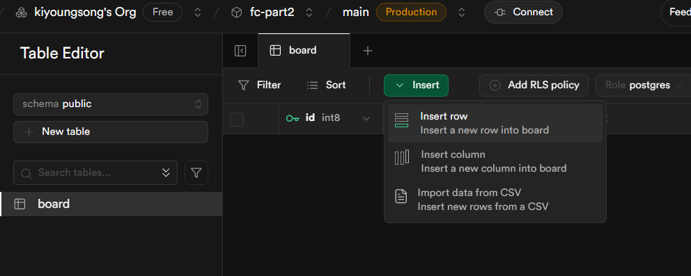 왼쪽에 생성된 테이블을 클릭하고 Insert 버튼을 누른뒤 Insert row 버튼을 클릭한다.