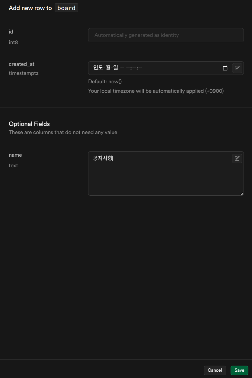 id와 created_at 값은 자동으로 입력되므로 name에 값을 넣고 Save 버튼을 클릭한다.