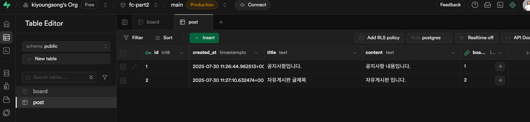 위에서 설명한 게시판 Table 데이터 생성처럼 동일한 방식으로 데이터를 넣어준다.