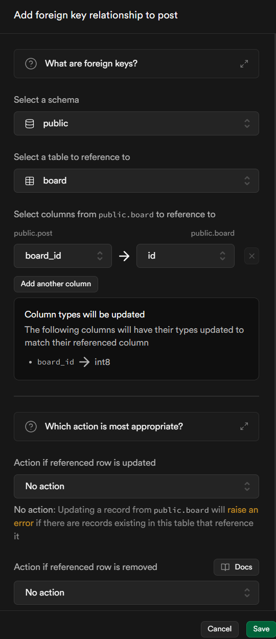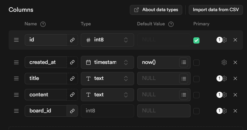 board_id를 foreign key로 설정하면 사진처럼 타입을 변경할 수 없게 변경이된다. 오른쪽에 톱니바퀴를 누르면 다양한 옵션들이 있는데 Null값을 허용, unique값을 사용, array형태로 사용 같은 옵션들이 있는데 필요에 맞춰 셋팅한다. 필자는 board_id 값의 null을 비허용하였다.