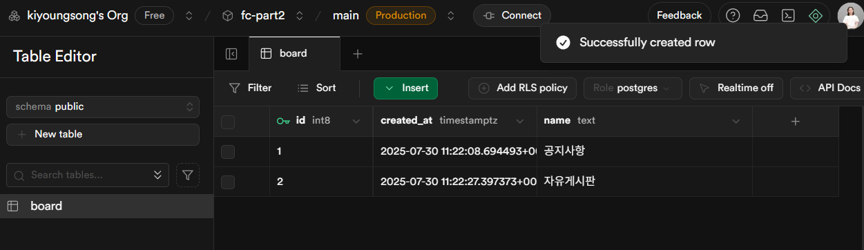 이렇게하면 테이블을 만들고 데이터를 생성하는 작업이 모두 완료되었다. 이제 Remix에서 데이터를 불러오는 작업을 진행하면 된다.
