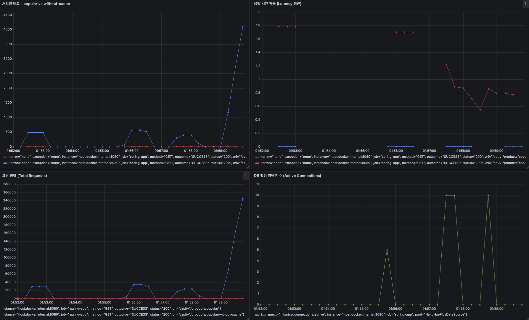 즉: 캐시 미적용은 DB 병목으로 RPS 제한 발생, 캐시는 병목 없이 처리량이 상승.