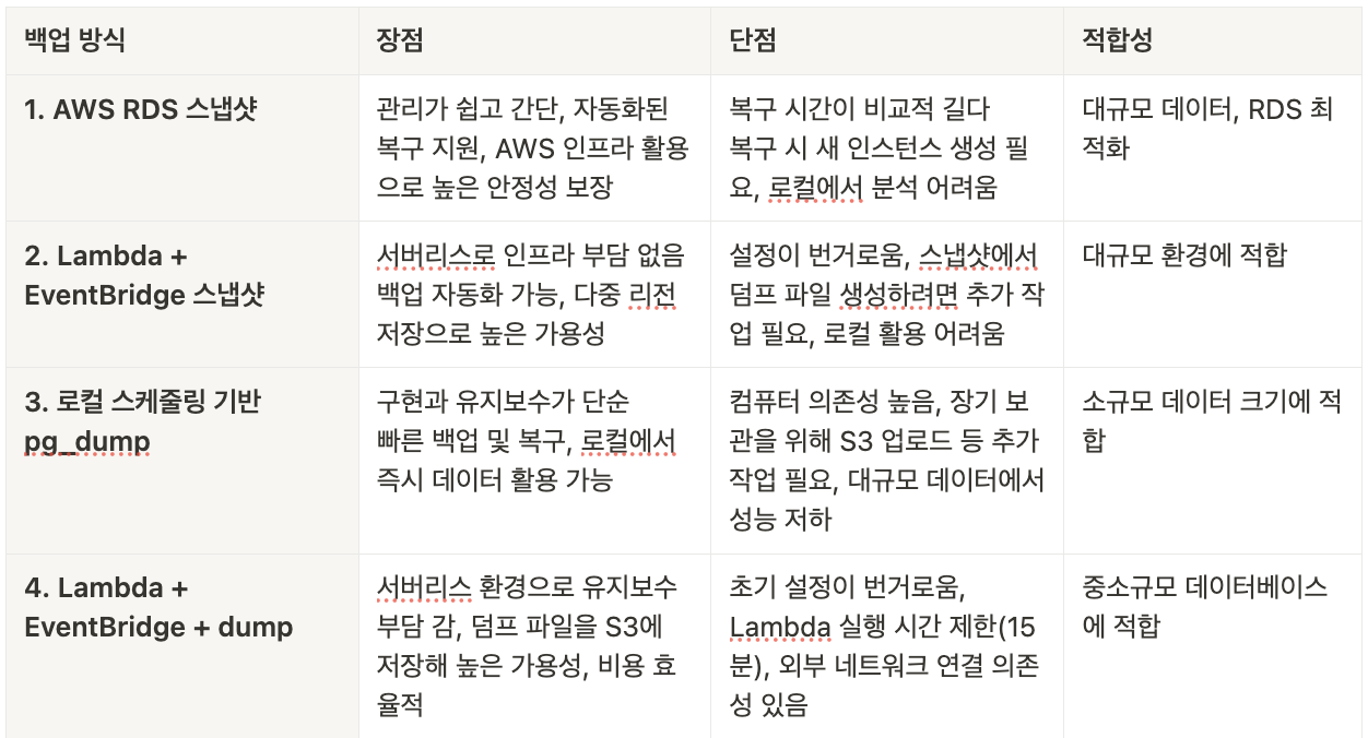 또한, 복구 속도가 덜 중요하고 AWS RDS 인프라를 활용한 안정성을 중시하는 경우, AWS RDS 스냅샷 또는 Lambda + EventBridge 스냅샷 방식도 검토할 것이다