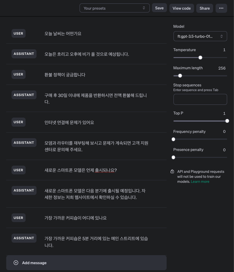 학습된 모델을 사용하여 입력 데이터에 대한 응답을 생성하고 결과를 확인합니다.