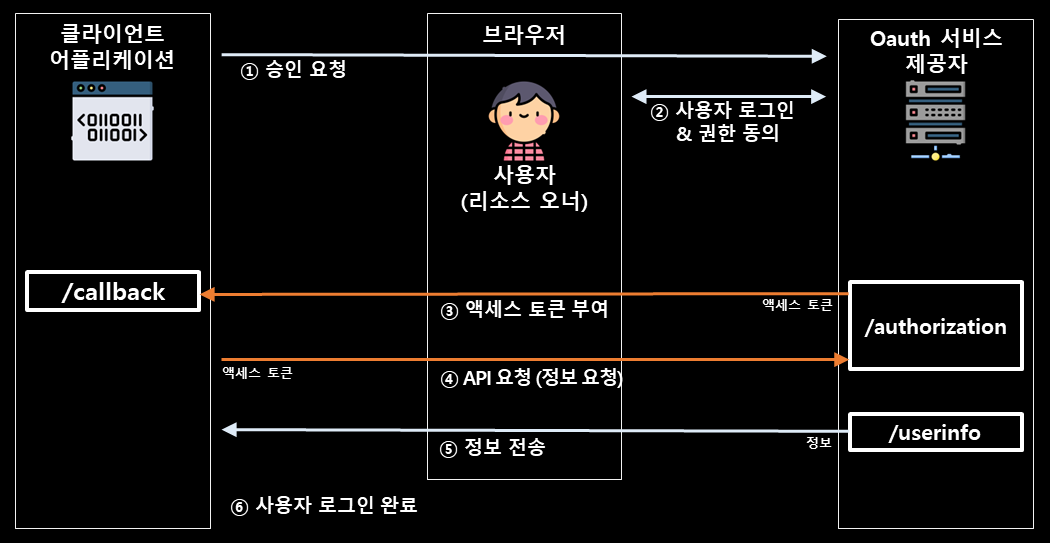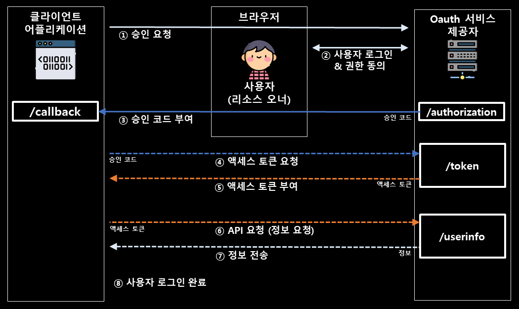 리소스 오너가 동의 시 OAuth 서비스 제공자자는 클라이언트 어플리케이션**에게 인증 코드 또는 토큰을 부여하여 이후에 정보 요청 및 검증에 사용되게 됩니다.