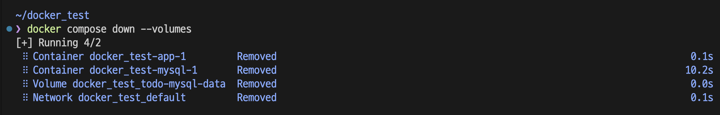 컨테이너들을 킬 때는 docker compose up -d 으로 켰으니까, 반대로 끌 때는 docker compose down으로 끄면 된다. 그런데 만약에 볼륨을 생성했다면 --volumes 옵션을 꼭 줘야 같이 사라진다!