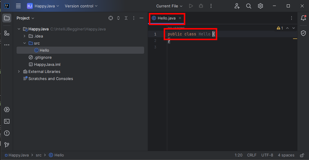 나는 Hello라는 클래스를 입력했고, 입력한 클래스와 동일한 이름의 파일이 만들어진 것을 확인 할 수 있다. 클래스 명과 파일 명은 반드시 동일해야한다.