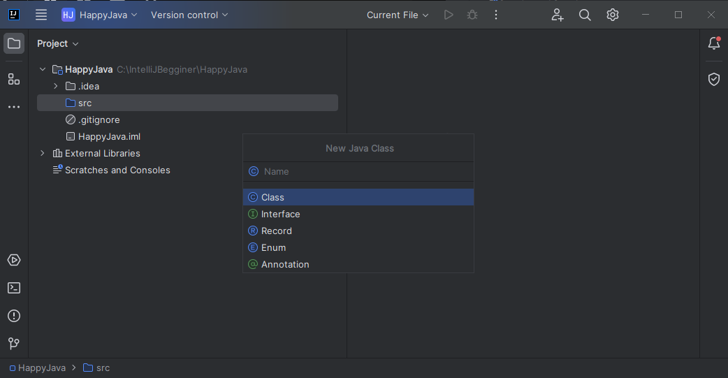src폴더에 마우스 오른쪽 > New Java Class 선택 > class Name 입력