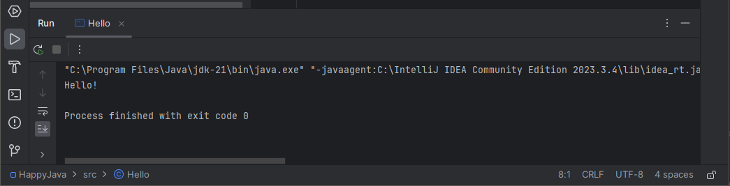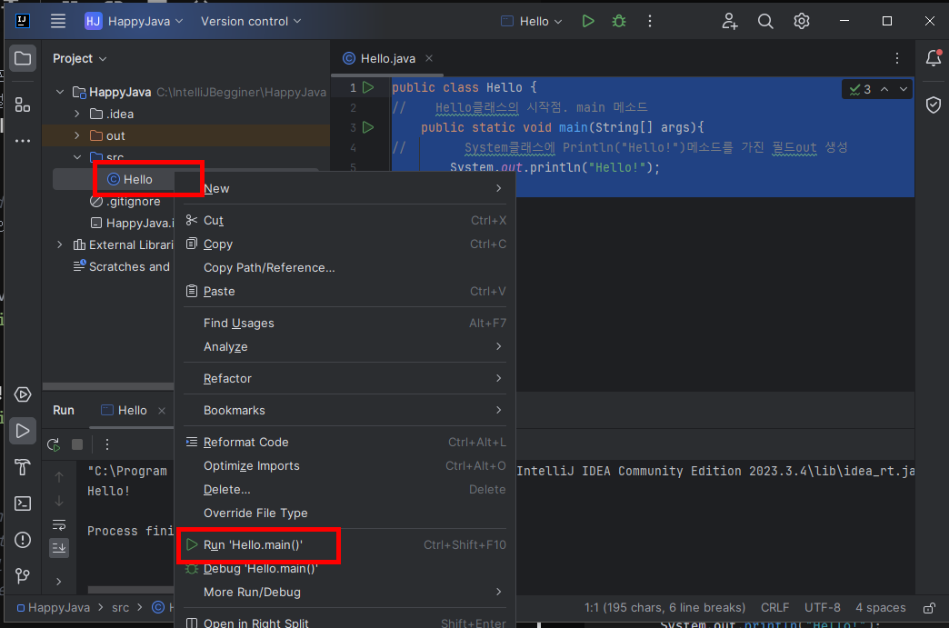 왼쪽 프로젝트 side에서 Hello.class파일에 마우스 오른쪽 버튼으로 클릭하고 Run을 선택하면 자동으로 파일을 컴파일하고 실행해준다.