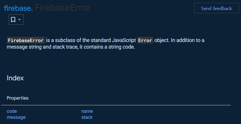 콘솔의 FirebaseError는 JavaScript Error객체의 하위 클래스이고, 메시지 문자열 및 스택 추적 외에도 문자열 코드가 포함되어 있다고 한다.
