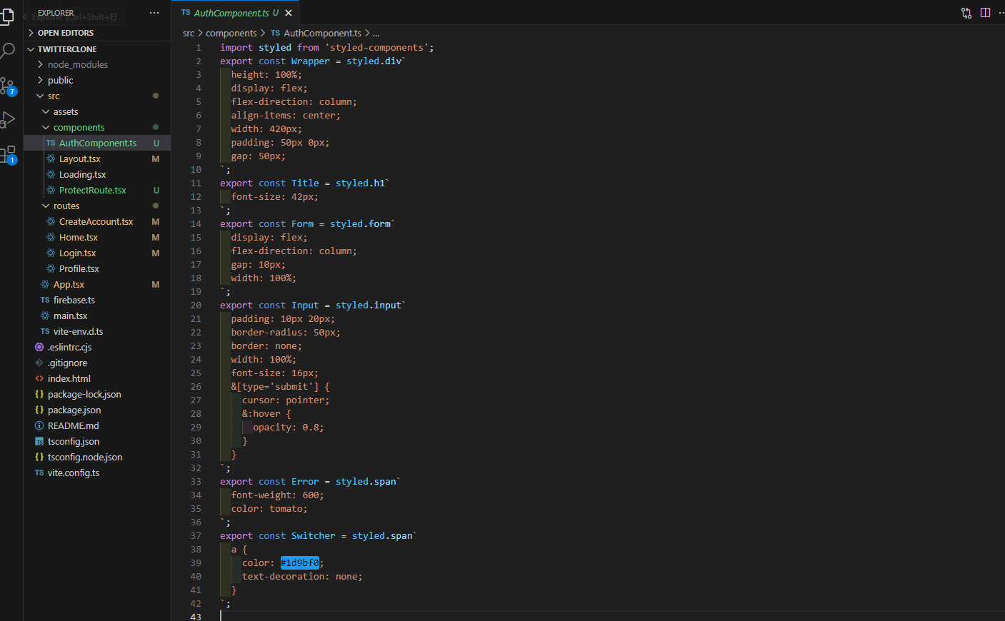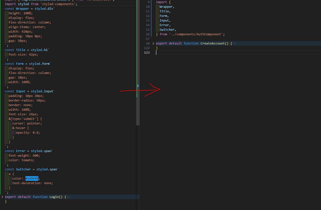 CreateAccount.tsx와 Login.tsx에서 중복으로 사용되던 styled-components들을 모두 하나로 묶은 컴포넌트 파일을 만들었다.