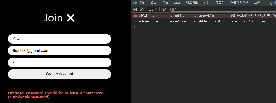 Password도 Firebase의 기준에 충족되지 않으면 에러메세지가 출력되고 페이지는 redirect되지 않는다.