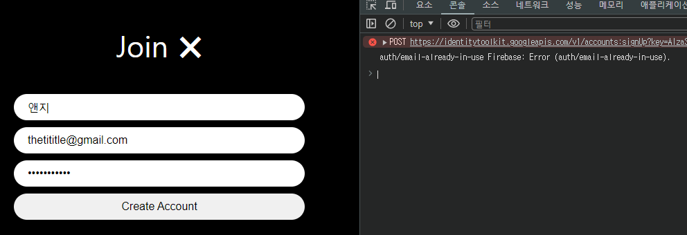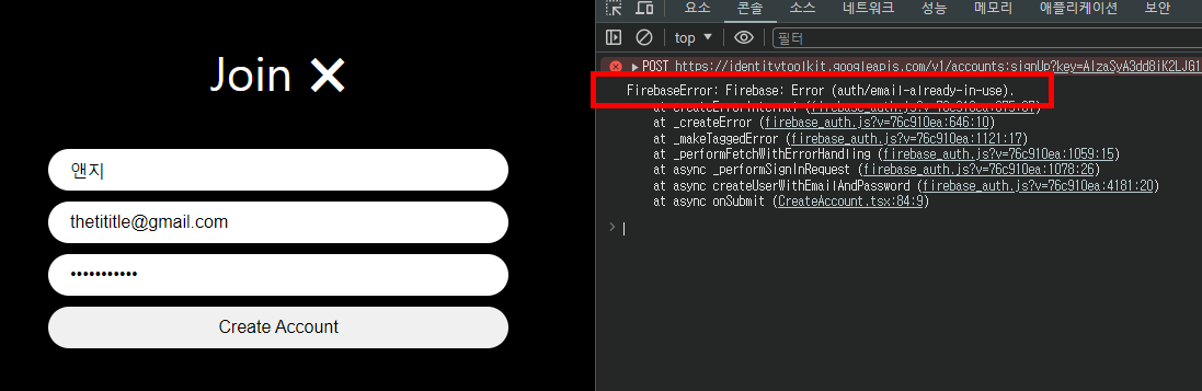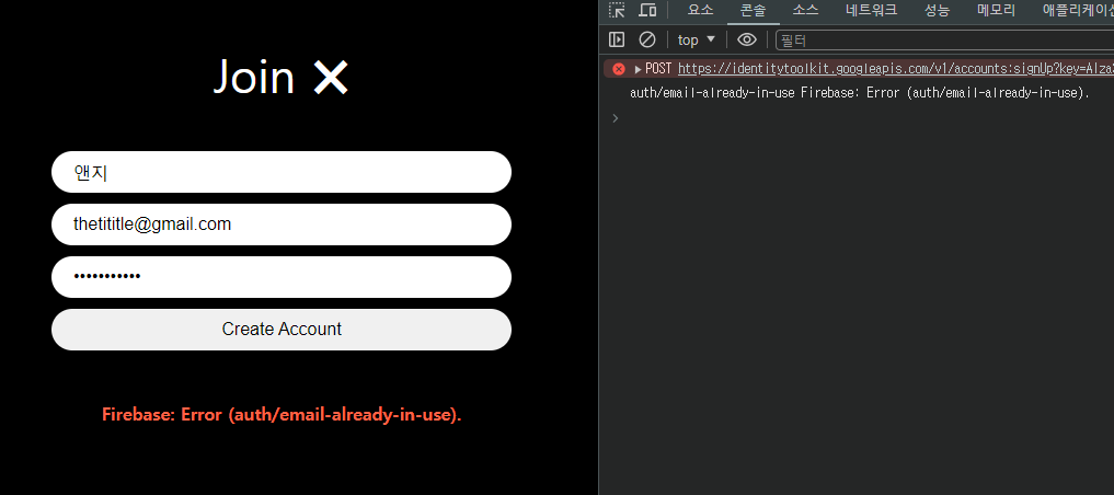 catch를 살펴보기 위해 콘솔을 추가하고, 기존에 사용했던 email로 계정을 다시 만들어봤다.