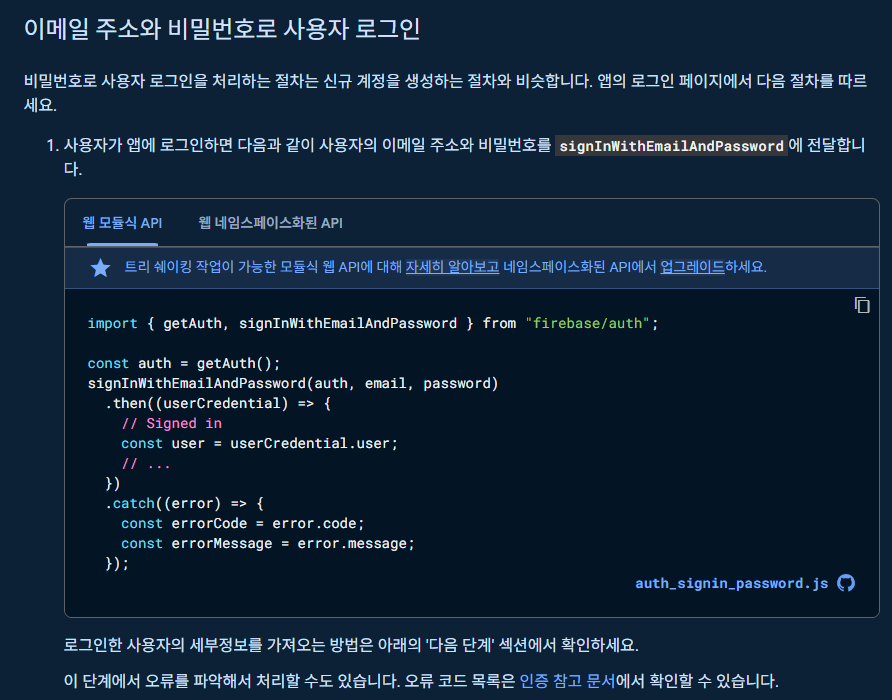 필요한 메소드는 signInWithEmailAndPassword이다.