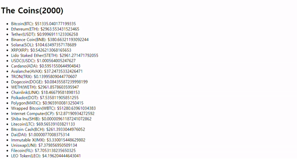 2. ์ฝ์ธ์ data๋ฅผ ๊ฐ์ ธ์ค๋ฉด loading ๋ฉ์ธ์ง๋ ์จ๊ธฐ๊ณ SUPER COOL COIN LIST๋ฅผ ๋ณด์ฌ์ค๋ค.