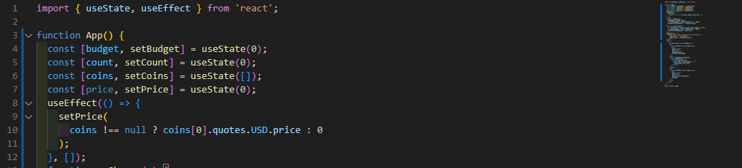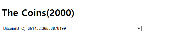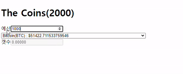 ์ ๊ฐ๊ฒฉ์ ๋ฐ์์ค useState๋ฅผ ๋ง๋ค๊ณ , select์์ defaultValue๋ก coins๊ฐ ๋น๊ฐ์ด ์๋๋ผ๋ฉด coins[0]์์ price๋ฅผ state๋ก ๋๊ธฐ๋ผ๊ณ ํ๋ค.