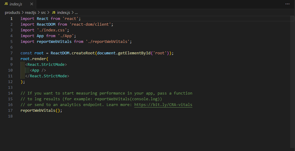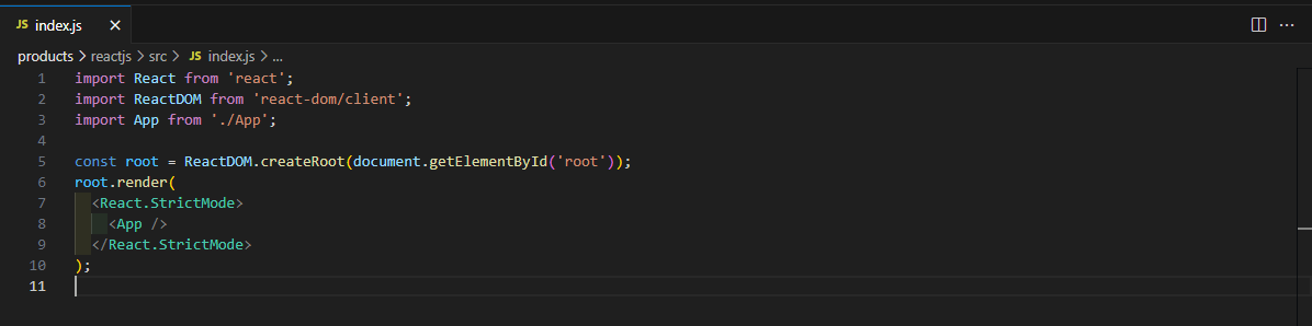 root๊ฐ ์๊ณ , root์์ App์ renderํ๋ ๊ตฌ์กฐ์ด๋ค.