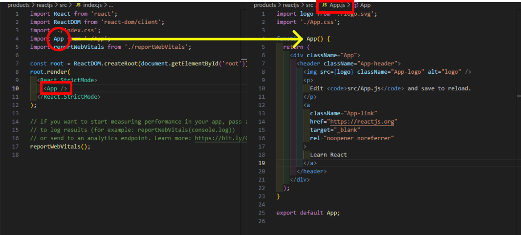 ํจ์ ์ปดํฌ๋ํธ์ธ App์ด index.js์์ ๋ถ๋ ค์ง๋ ๊ฒ๊น์ง ์ต์ํ ๊ตฌ์กฐ์ด๋ค.
