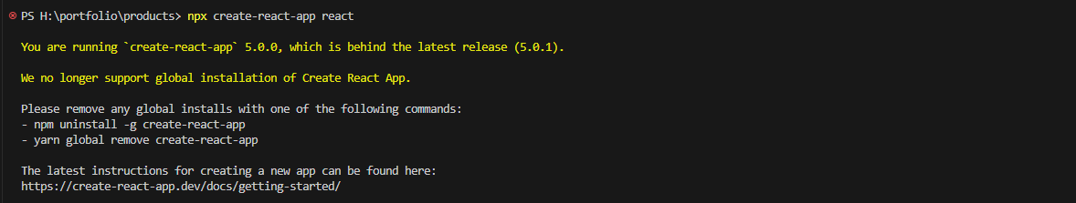 ํ์ง๋ง ์ฌํ๊ฒ๋ ์ต์ ๋ฆด๋ฆฌ์ฆ์์ ๋์ด์ Create React App์ ์ ์ญ ์ค์น๋ฅผ ์ง์ํ์ง ์๋๋ค๊ณ ํ๋ ํฐ๋ฏธ๋์์ ์ ๊ณตํ ํํธ๋๋ก npm์ ์ฌ์ฉํ์ฌ ์ค์น๋ฅผ ํ๋๋ก ํ๋ค.