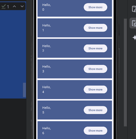위 코드는 1,000개의 인사말을 생성하므로, 화면에 모두 표시되지는 않겠지만 리스트가 굉장히 커진다. 이 경우 성능이 크게 저하될 수 있다. 실제 에뮬레이터에서 이 코드를 실행하면 성능이 떨어지는 것을 확인할 수 있는데, 심할 경우 에뮬레이터가 멈출 수도 있다.