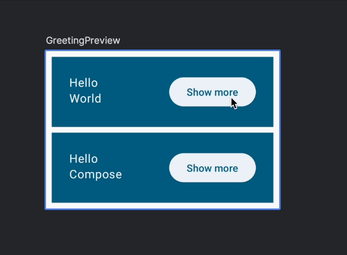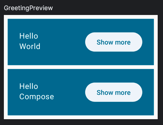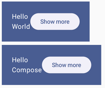 이 버튼을 누르면 어떤 일이 발생하게 만들 수 있는 클릭 동작(onClick)을 설정할 수 있다. 버튼 안에 Text 컴포저블을 넣어서 "Show more"이라는 글자를 버튼에 표시한다.