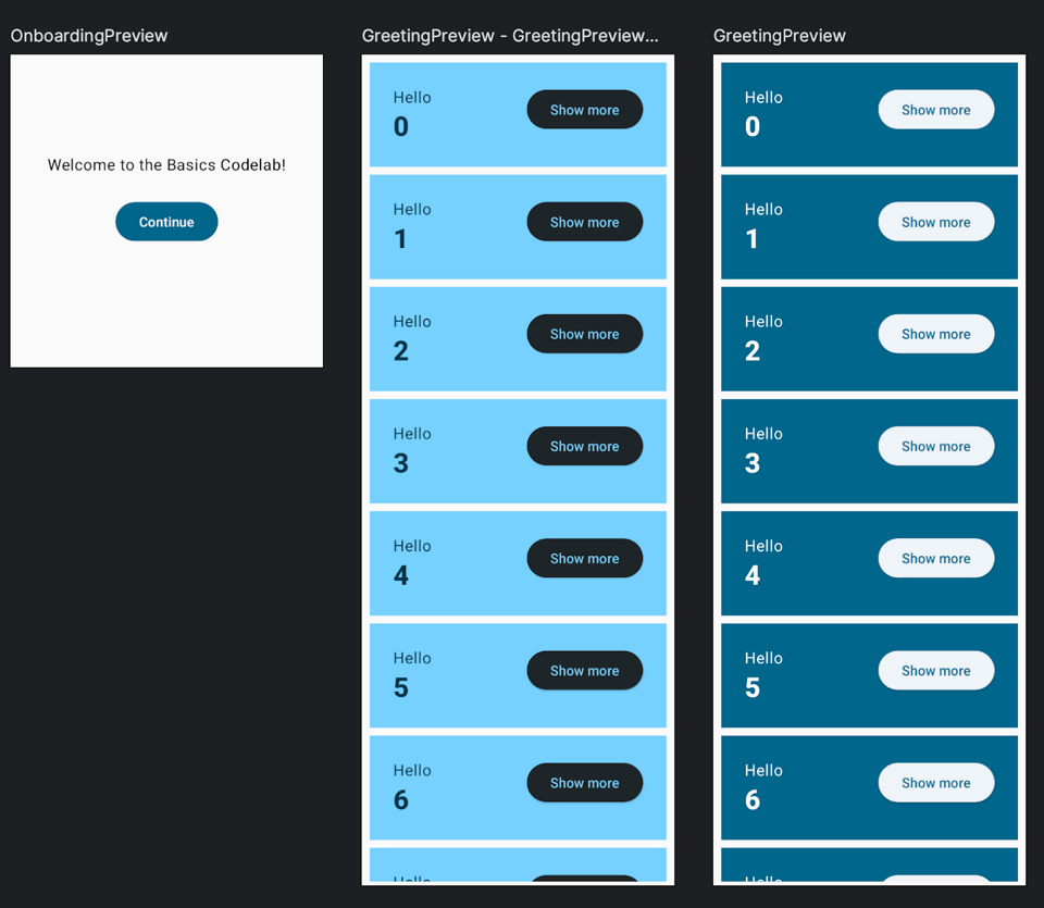 GreetingPreview: Greetings() 컴포저블의 UI를 가로 320dp의 화면에서 미리보기로 보여준다. 한 번은 기본 모드로, 한 번은 다크 모드로 미리보기를 생성한다.OnboardingPreview: OnboardingScreen 컴포저블의 UI를 가로 320dp, 세로 320dp 크기의 화면에서 미리본다. onContinueClicked가 비어 있으므로 버튼을 눌러도 동작하지 않지만, UI 미리보기용이므로 상관없다.MyAppPreview: MyApp 전체 화면을 미리본다. 이를 통해 앱의 전체 UI를 한 번에 확인할 수 있다.출처