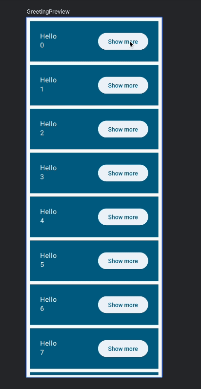 Greetings 컴포저블은 여러 개의 Greeting 카드를 리스트 형태로 보여준다. 여기서 LazyColumn을 사용해 효율적으로 많은 항목을 스크롤할 수 있게 처리했다.