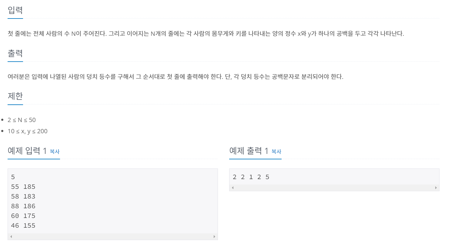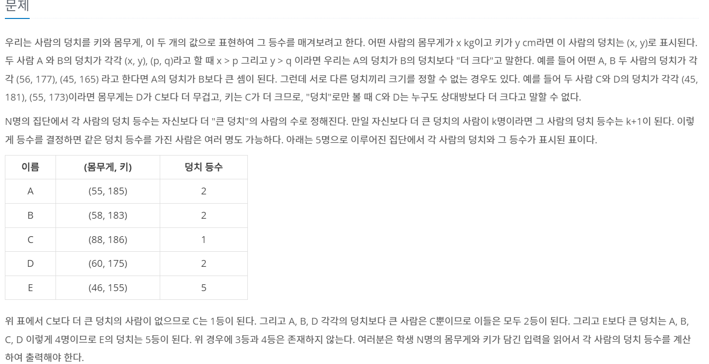 만약 자기보다 덩치가 큰 사람이 없을 경우 rank 는 1 이 될 것이고, 덩치가 큰 사람이 K 명 있을 경우 rank + K 가 자신의 랭크(순위)가 될 것이다.