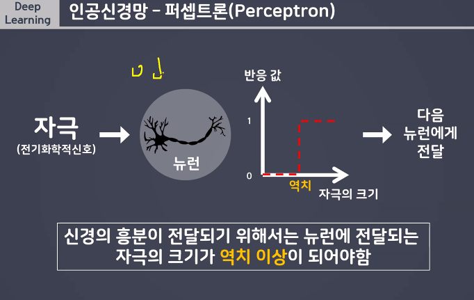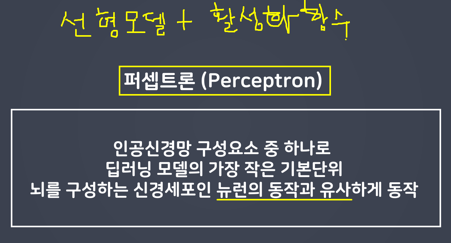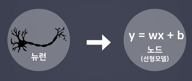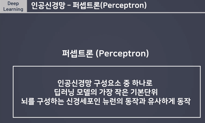 인공신경망 구성요소 중 하나로 딥러닝 모델의가장 작은 가본단위 뇌를 구성하는 신경새포인 뉴런의 동작과 유사하게 (similar) 동작