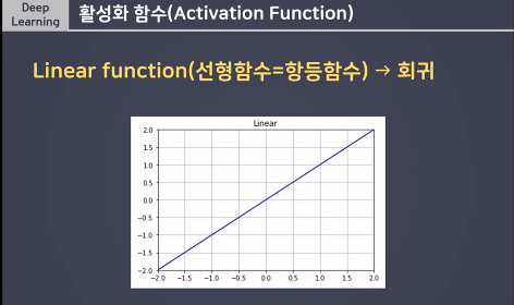 - 회귀: 항등함수 (linear) y = x 선형모델이 풀력한 결과를 그대로 출력해주기 위함 (변화해줄 필요가 없기때문)_default값이기 때문에 따로 적어주지 않아도됨!