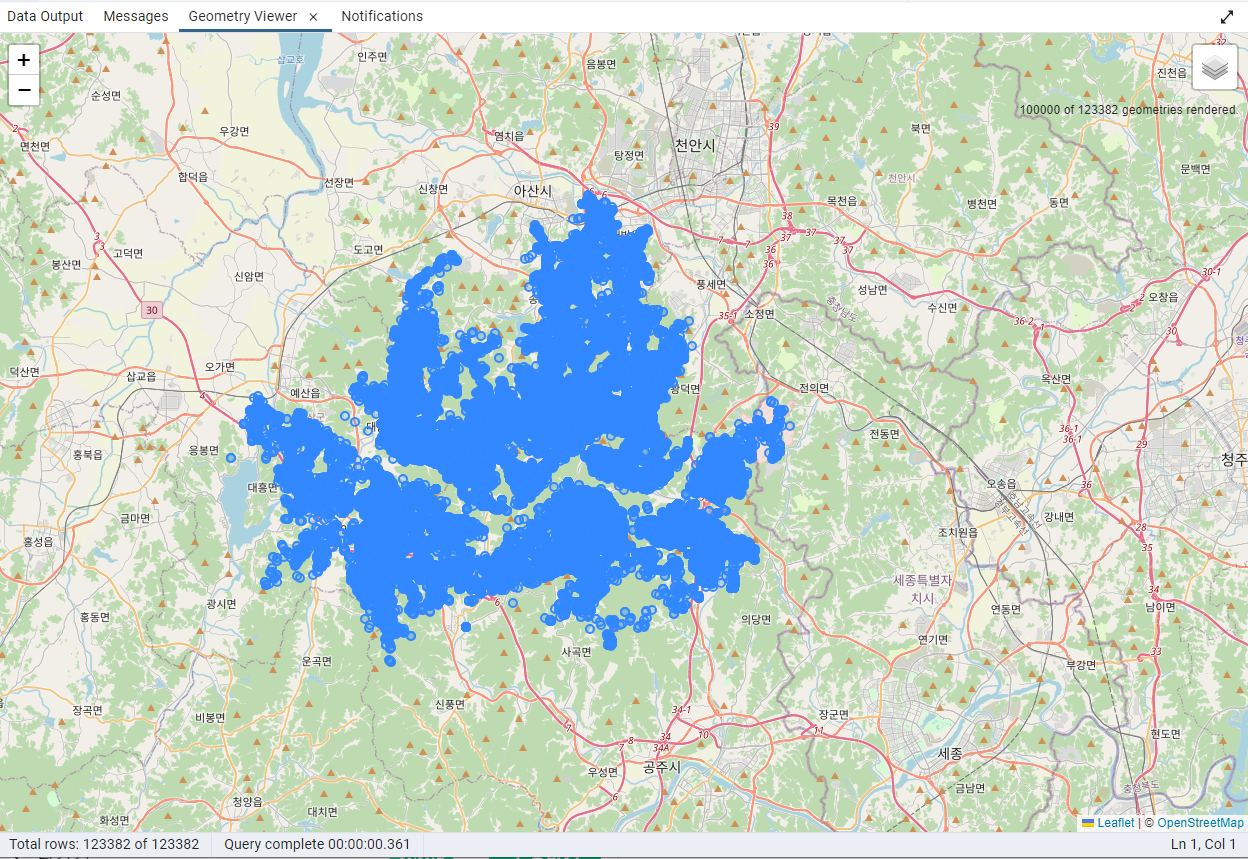위의 코드를 통해 위치 정보를 변환하여 DB에 저장한 후, postgreSQL의 GUI기반 관리도구인 pgAdmin4를 활용하여 각 음식점들의 위치정보를 Geometry viewer를 통해 지도에 표시하여 확인해보았다.