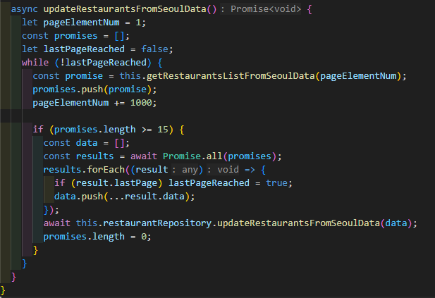 DB에 저장하는데 소요되는 시간을 측정해본 결과 약 12분 정도였고, 이는 사용자가 많이 없는 새벽 시간에 음식점 정보를 업데이트한다 라는 조건이 있더라도 사용자 경험을 저해하는 요소가 될 수 있다고 생각하여 개선이 필요하다고 판단했다.