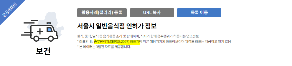 "서울시 일반음식점 인허가 정보" API 사용 중 문제가 됐던 다른 하나는 좌표계 변환 과정에서 발생했다.