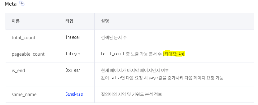 처음에 공식문서를 보며 응답에 대한 meta data 부분에서 pageable_count의 값이 최대 45라는 것을 보며 단순히 한 페이지에 45개까지 보여주나 보다 하고 넘어갔었는데 알고보니 같은 api 요청에 대해 total_count가 훨씬 크더라도 최대 45개의 응답만 보여준다는 의미였다...!!