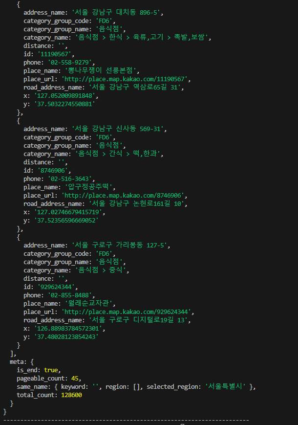 실제로도 의도대로 잘 동작하는지 확인하기 위해 간단하게 api를 한번 호출해서 응답을 출력해보았고, 결과는 만족스럽게도 목표했던 서울시의 음식점 정보가 잘 출력되었다.