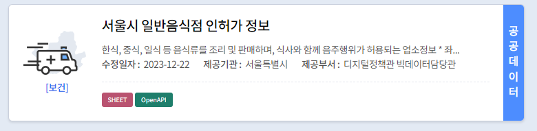해당 사이트들에서 우리 프로젝트에서 필요한 정보를 모두 제공하는 api를 찾아다녔고, 서울시 open api에서 제공하는 "서울시 일반음식점 인허가 정보"를 활용할 수 있겠다는 결론에 도달했다.