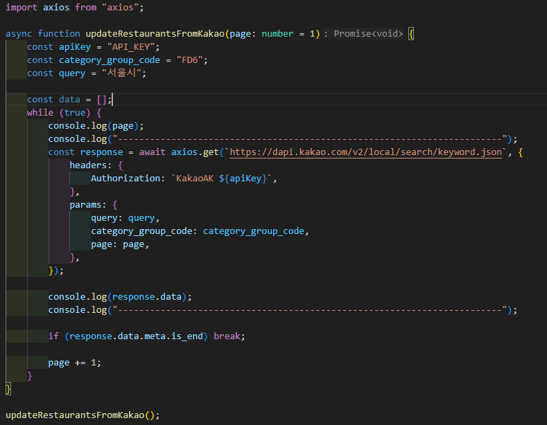위의 코드는 카카오 지도 api 공식 문서를 바탕으로 응답의 메타데이터 중 현재 페이지가 마지막 페이지인지 여부를 판단하는 변수를 활용하여 마지막 페이지가 될때까지 페이지번호를 증가시키며 서울시 전체 음식점 정보를 받아오도록 작성했다.