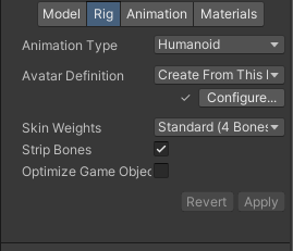 Anamation Type : Legacy : 옛날방식 , Generic : 만약에 사람형태가 아닌데 뼈대가 있으면 제네릭으로 하면 된다. / Humaniod : 사람형태면 이걸로 하면 된다
